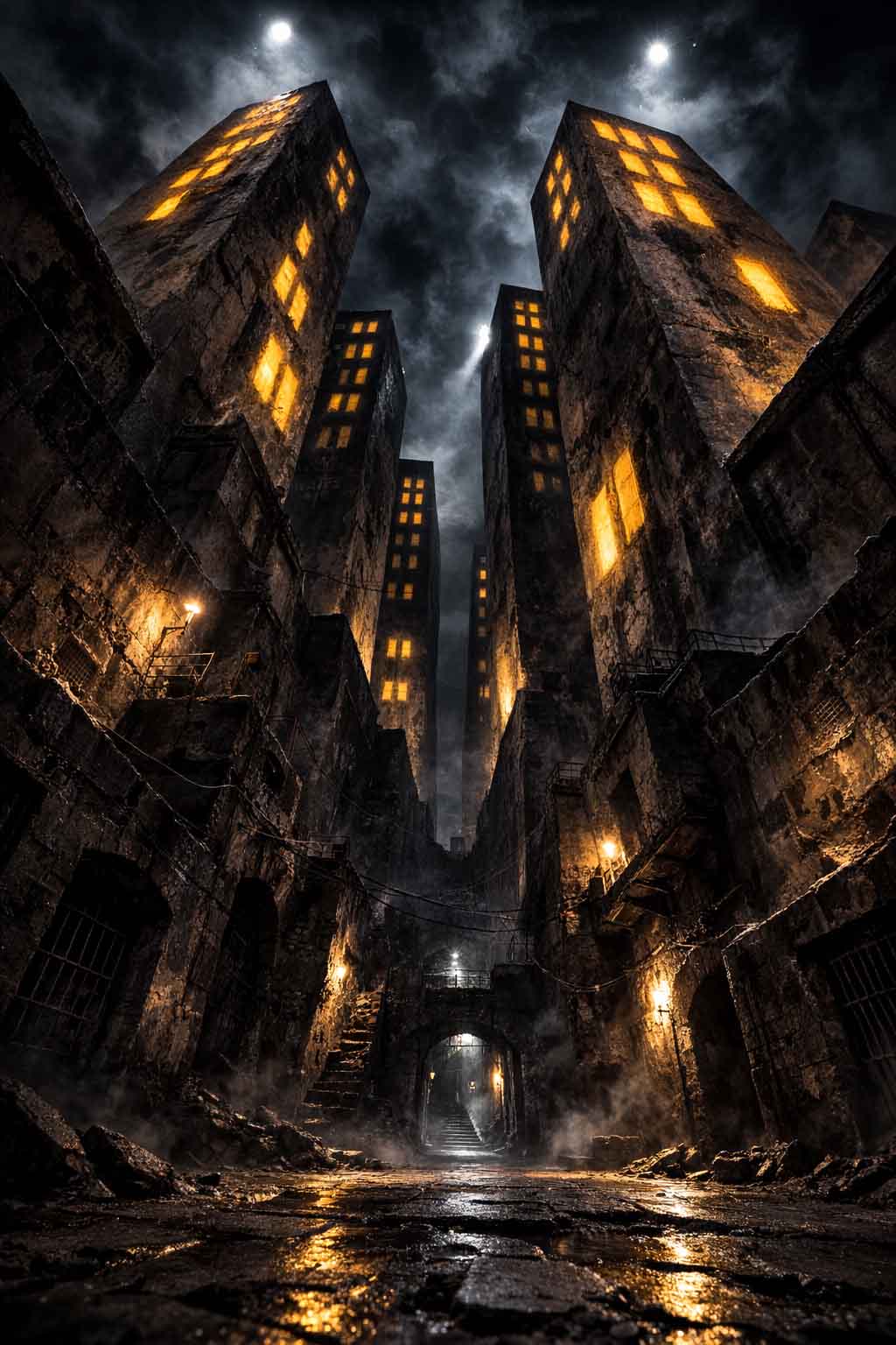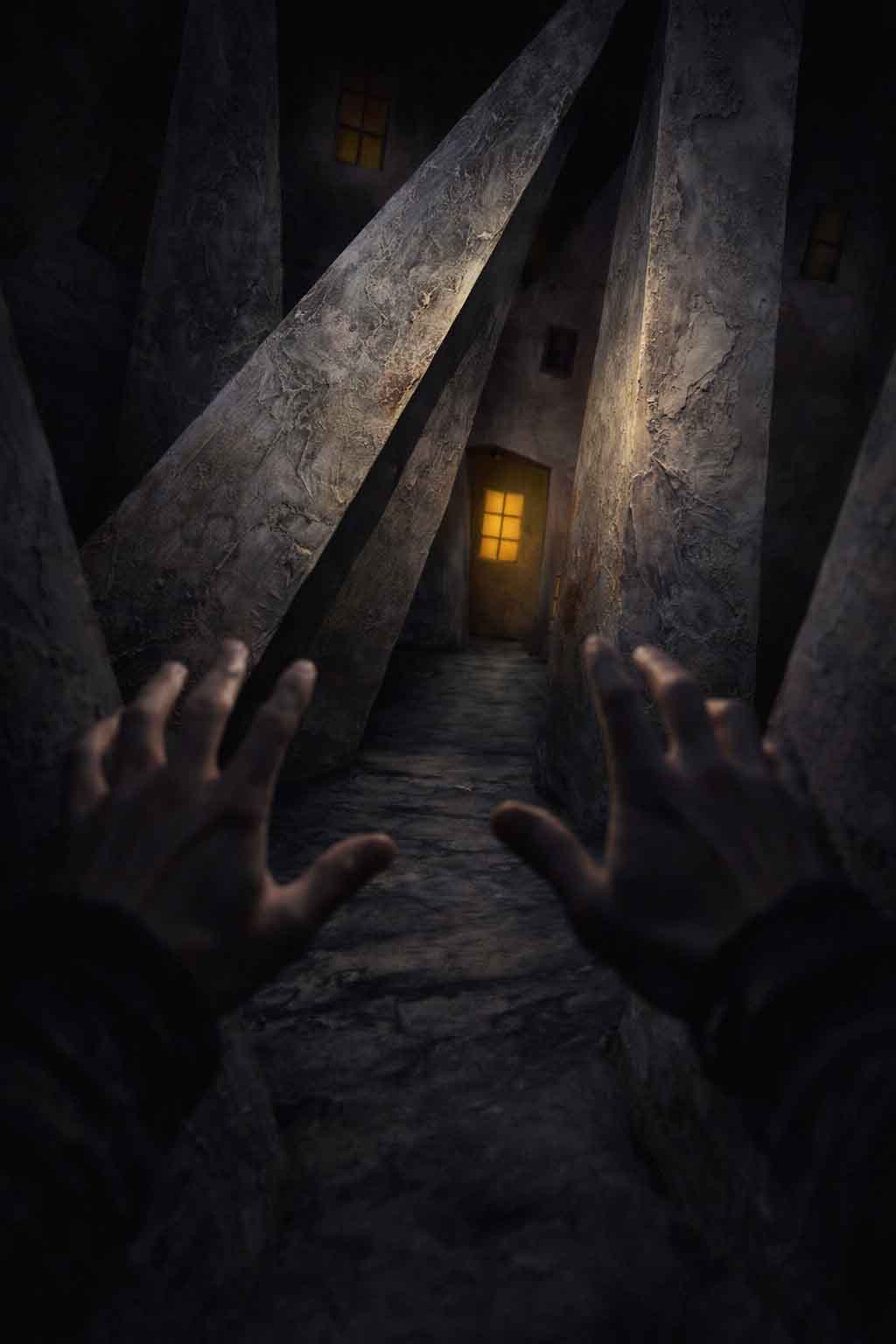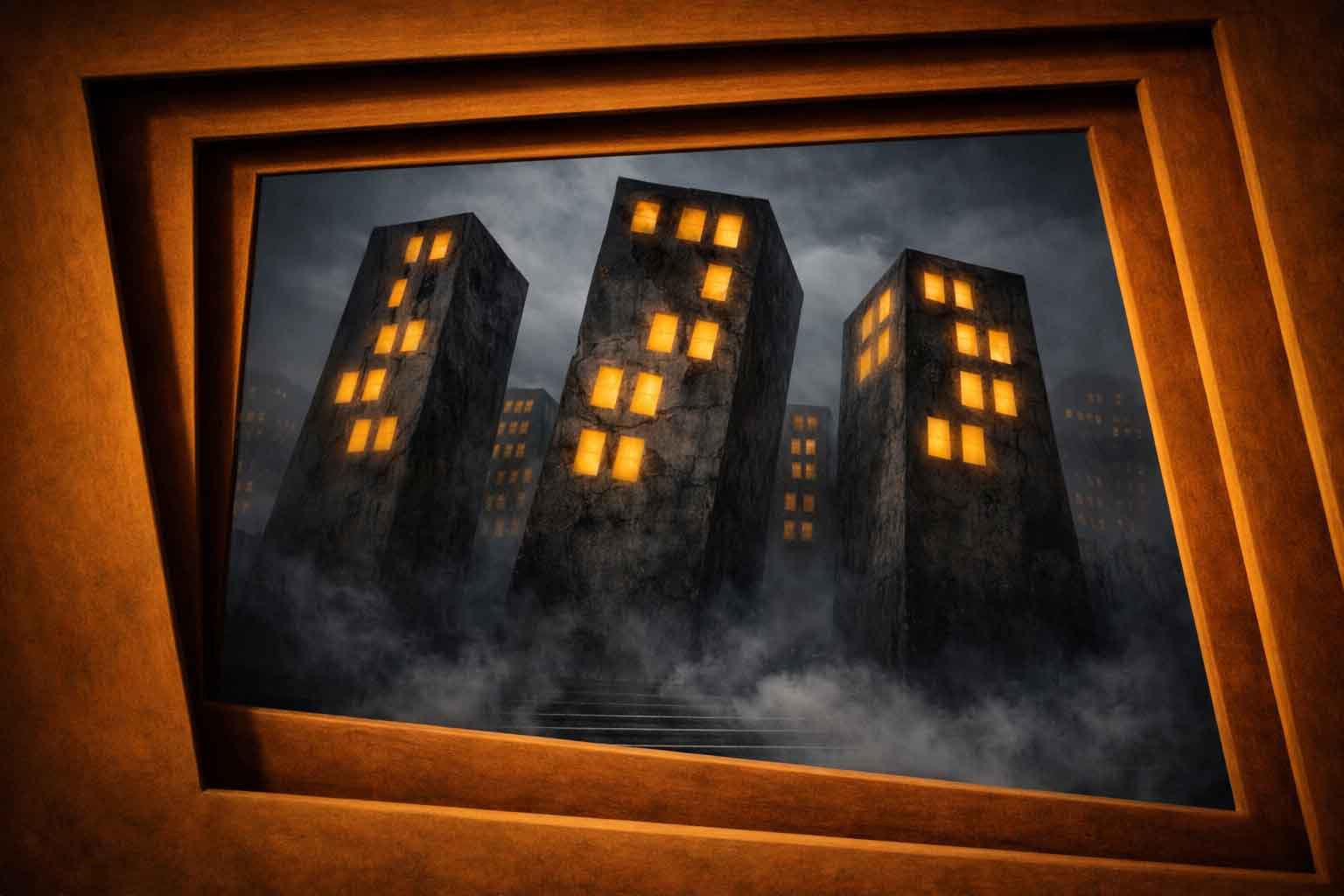 L’impianto dell’opera richiama l’espressionismo storico, ma qui la deformazione non è decorativa, è drammaturgica. I palazzi, con le loro superfici ruvide e segnate, gravano sulla scena come coscienze pesanti. I pilastri, che sembrano pulsare di materiale organico, invadono gli spazi con tagli trasversali e profondi. Le finestre illuminate — rettangoli gialli sospesi nel buio — non sono semplici punti luce, ma fenditure emotive. Sono occhi, sono presenze, sono frammenti di storie che non si vedono ma si percepiscono.