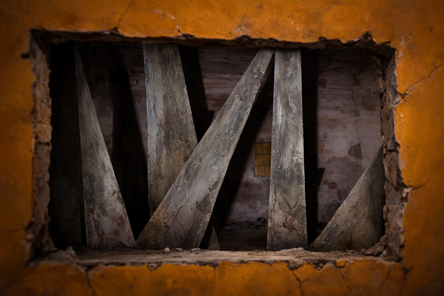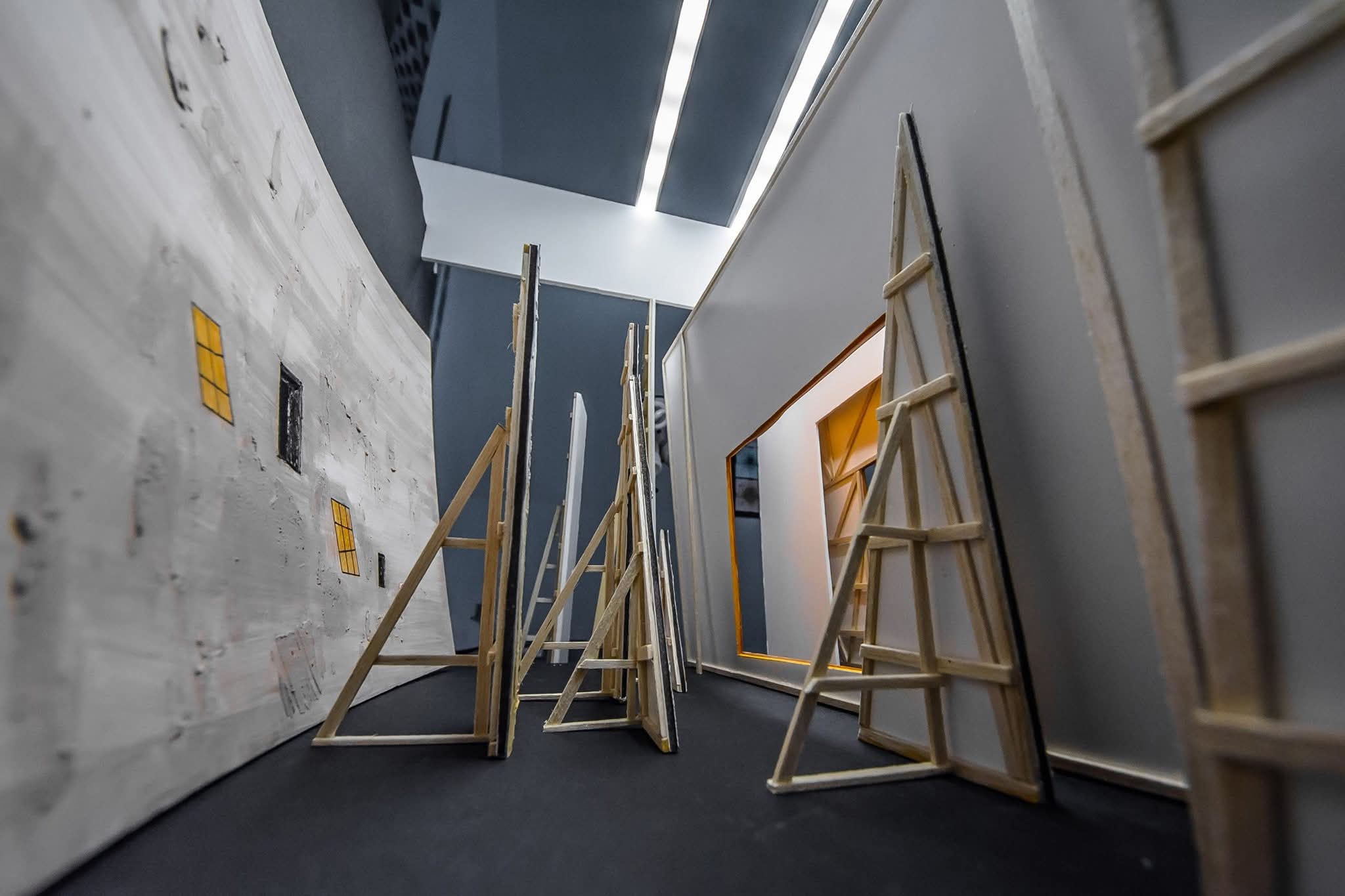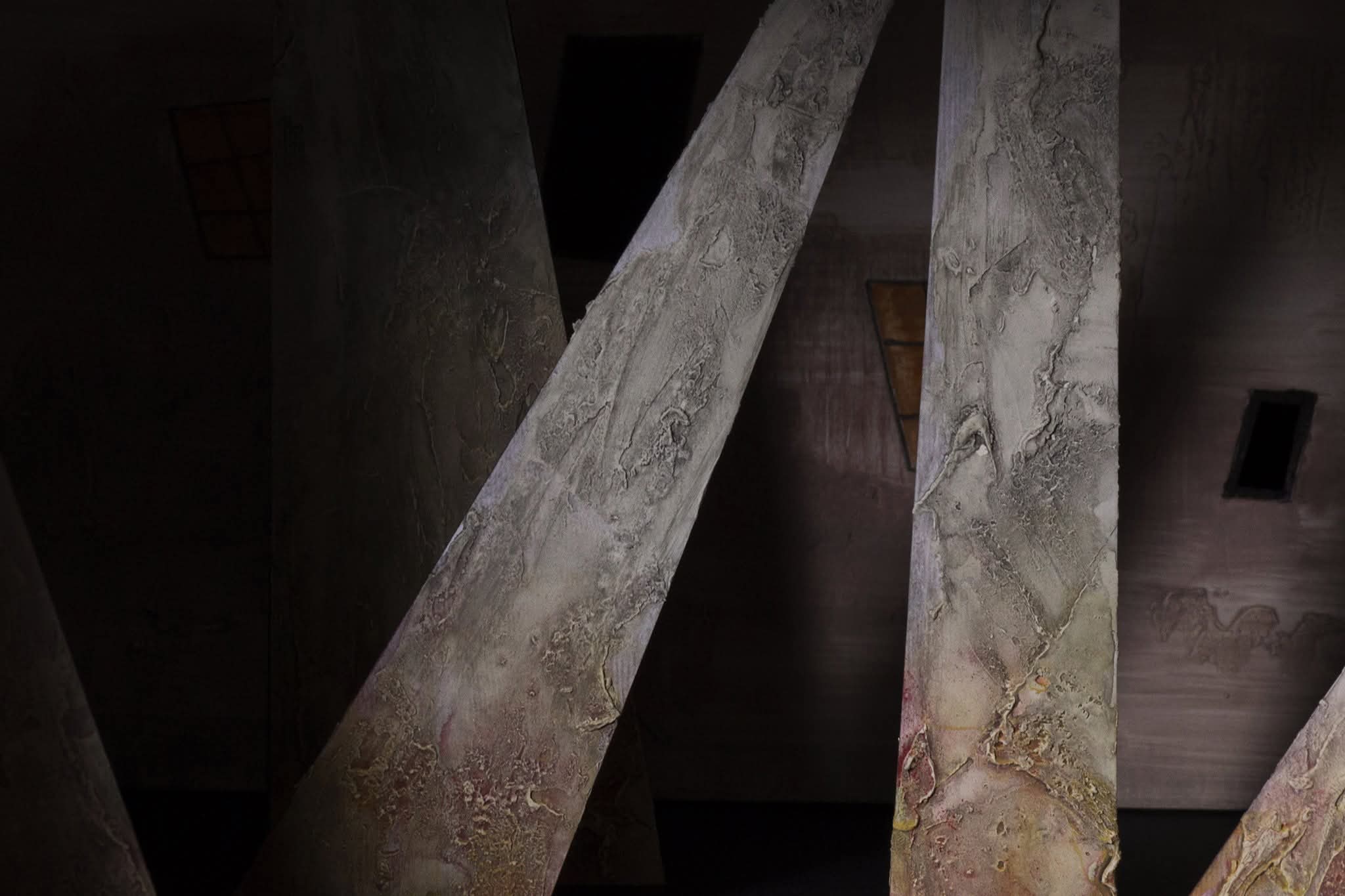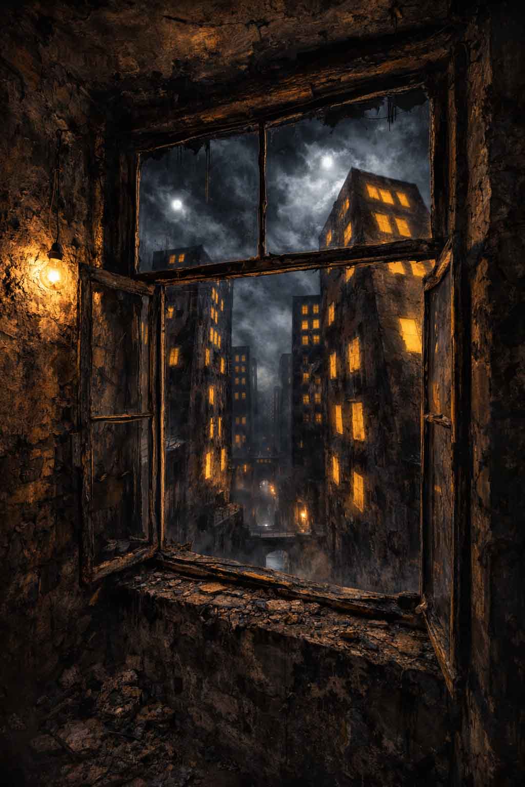 L’impianto dell’opera richiama l’espressionismo storico, ma qui la deformazione non è decorativa, è drammaturgica. I palazzi, con le loro superfici ruvide e segnate, gravano sulla scena come coscienze pesanti. I pilastri, che sembrano pulsare di materiale organico, invadono gli spazi con tagli trasversali e profondi. Le finestre illuminate — rettangoli gialli sospesi nel buio — non sono semplici punti luce, ma fenditure emotive. Sono occhi, sono presenze, sono frammenti di storie che non si vedono ma si percepiscono.